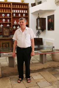 Fra Stipe sharing stories about many artifacts at the apothecary museum